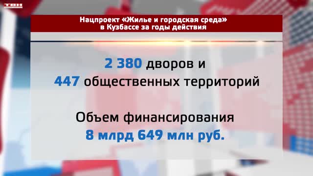 Нацпроект «Жилье и городская среда» за время своего действия подарил новый облик почти 3-ем тысячам объектам, а именно 2 380 дворов и 447 общественных территорий Кузбасса. На эти цели было направлено 8 миллиардов 649 миллионов рублей. Так, в Кемерове благоустроено 522 двора и 38 общественных пространств. В Новокузнецке — 486 придомовых территорий и 31 общественное пространство.