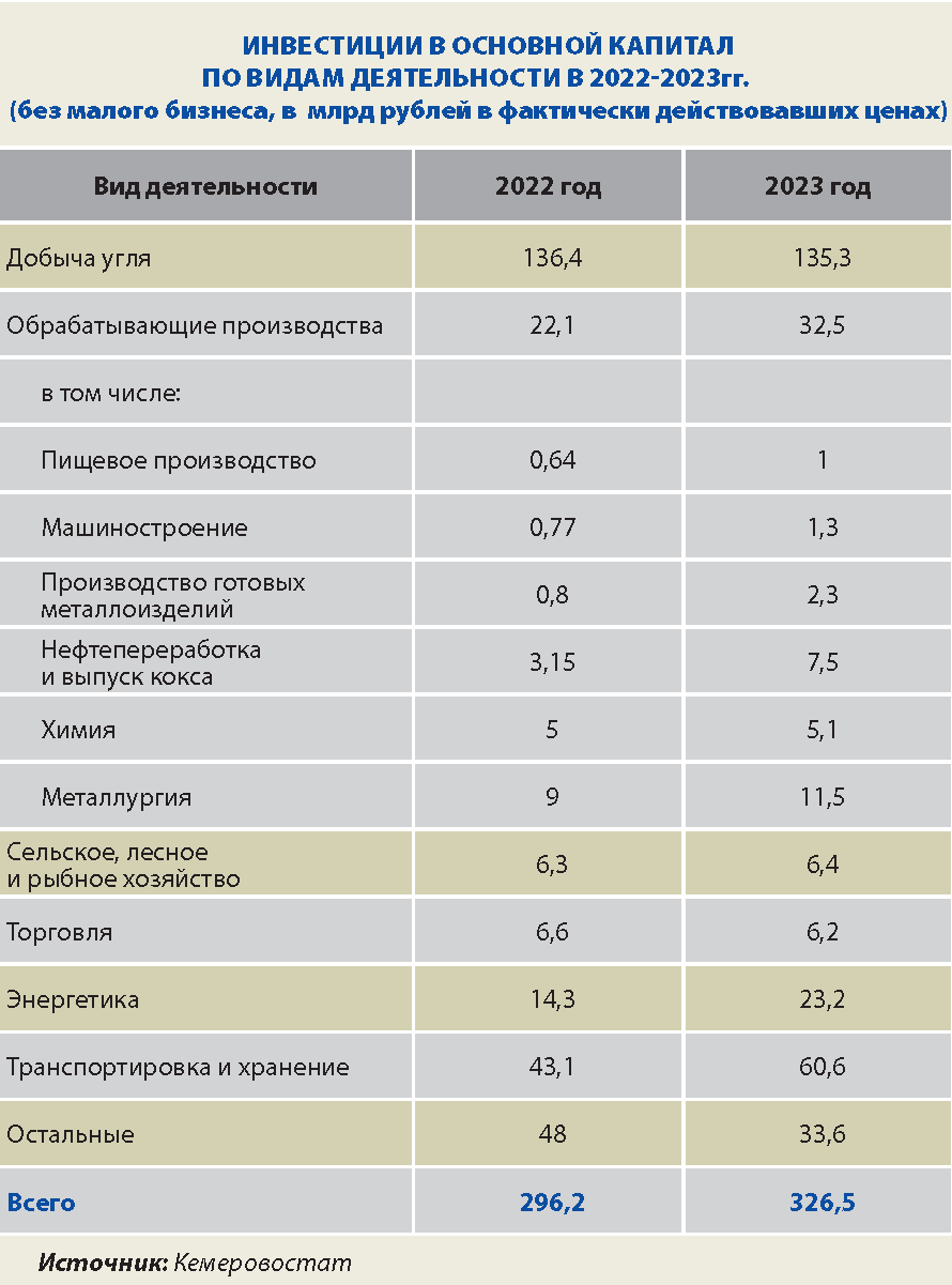 В прошлом году инвестиции в основной капитал в Кузбассе (включая оценку не наблюдаемых прямыми статистическими методами) составили 414,7 млрд рублей, что на 2% ниже уровня 2022 года. Самые большие инвестиции по отраслям были в прошлом году в угольной промышленности — 135,3 млрд рублей — и в транспортировке/хранении — 60,6 млрд рублей, сообщает Кемеровостат. При этом даже в текущих ценах (без учета инфляции) вложения в углепром в прошлом году снизились на 0,9 млрд рублей (в 2022 году составляли 136,4 млрд). А вот в транспортировку/хранение они выросли в текущих ценах на 17,5 млрд рублей, с 43,1 млрд.