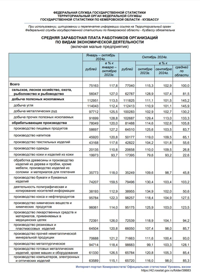 По информации, опубликованной статистиками региона, среднемесячная начисленная заработная плата работников в организациях Кузбасса (включая малые предприятия) за октябрь 2024 года составила 77 040 рублей и по сравнению с октябрём 2023 года возросла на 15,3%. Выросла она и по сравнению с сентябрём, когда озвучивалась сумма 74 507 рублей.