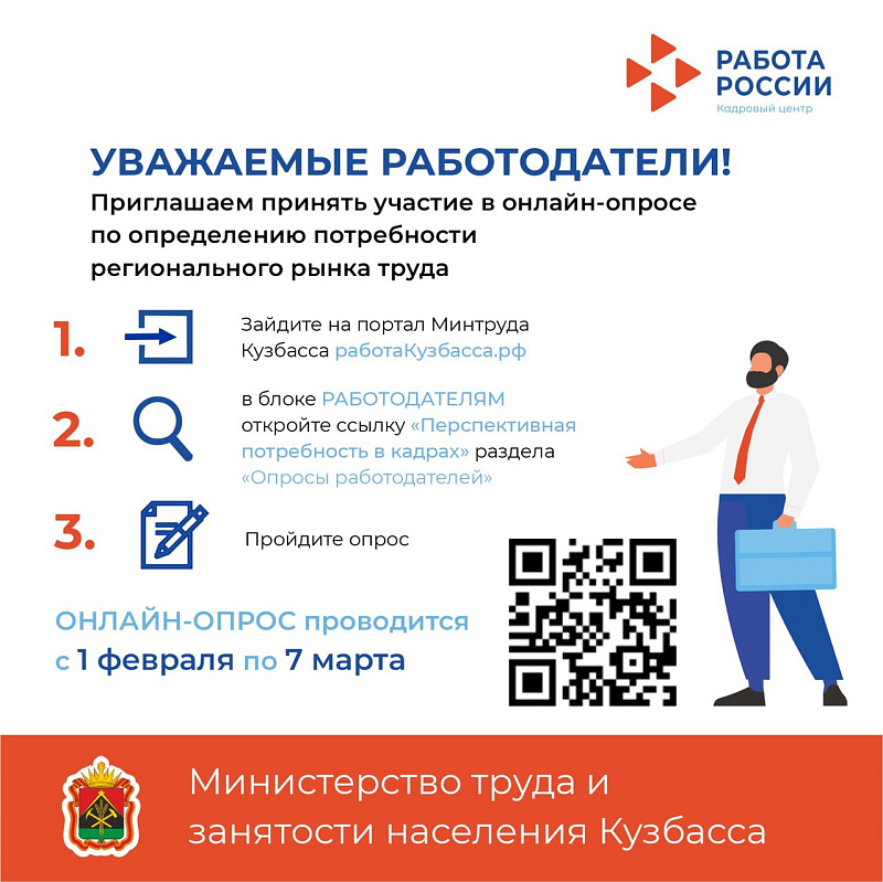 Опрос проводится на официальном сайте Министерства труда и занятости населения (работакузбасса.рф) по адресу: https://ufz-kemerovo.ru/ (блок – Работодателям, раздел «Опросы работодателей», подраздел «Потребность в кадрах») или по адресу: https://clck.ru/33NKAj .