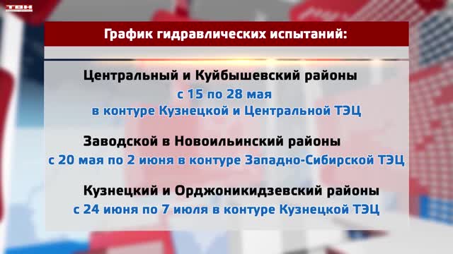 Отопительный сезон завершен. Начинаются гидравлические испытания тепловых сетей. Первыми отсутствие горячей воды почувствуют жители Центрального и Куйбышевского районов. Ресурс отключат с 15 по 28 мая. Это потребители Кузнецкой и Центральной ТЭЦ. Следом идут Заводской и Новоильинский районы. Горячей воды не будет с 20 мая по 2 июня. Завершают цикл гидравлических испытаний Кузнецкий и Орджоникидзевский. Горячего водоснабжения не будет с 24 июня по 7 июля. Помимо испытаний стартует ремонт сетей.