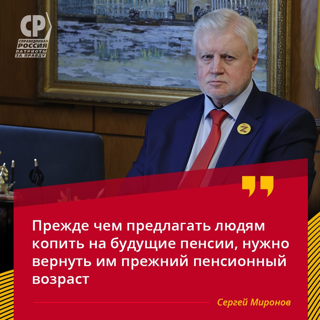 "Необходимо вернуться к прозрачной, справедливой солидарной пенсионной системе, а главное, к прежнему пенсионному возрасту. Если государство пойдет навстречу гражданам, тогда, возможно, и отношение людей к пенсионным накоплениям будет иным," – считает председатель Социалистической партии "СПРАВЕДЛИВАЯ РОССИЯ – ПАТРИОТЫ – ЗА ПРАВДУ" Сергей Миронов.