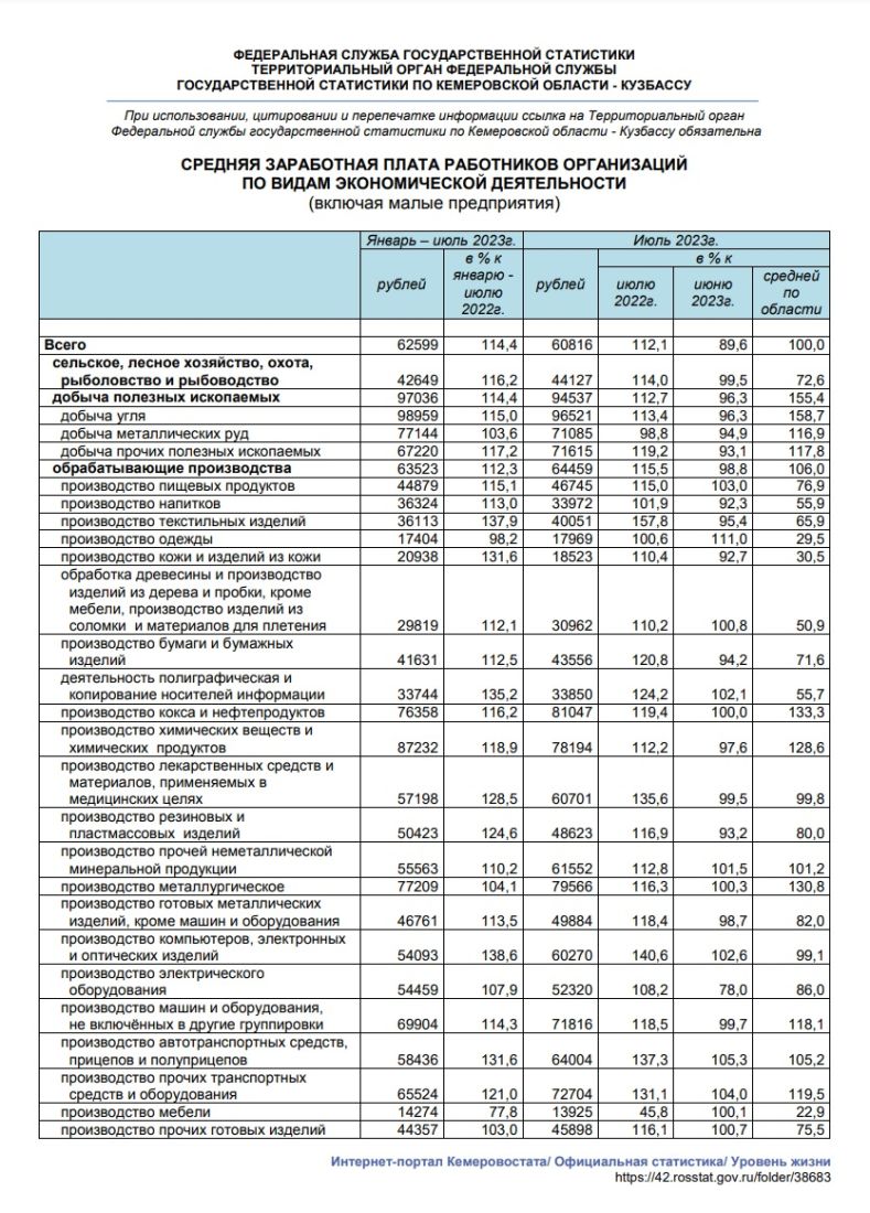 По данным ведомства, среднемесячная начисленная заработная плата работников в организациях Кузбасса (включая малые предприятия) за июль 2023 года составила 60 816 рублей и по сравнению с июлем 2022 г. возросла на 12,1%.