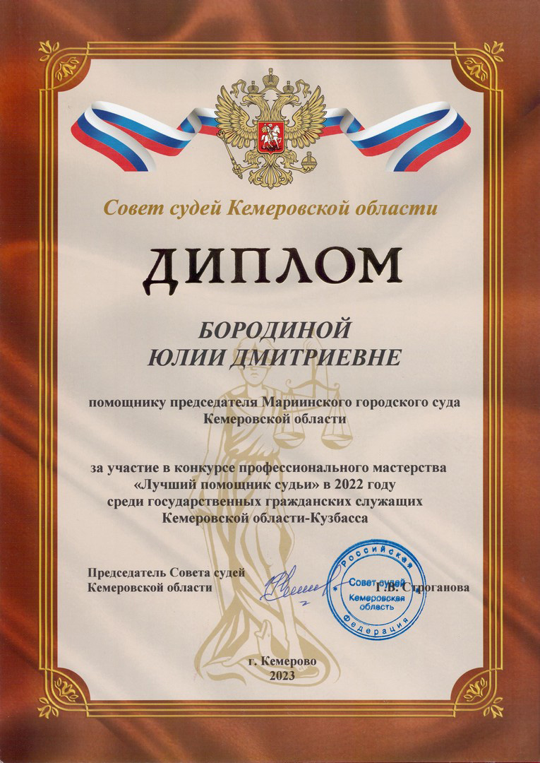 В конкурсе профессионального мастерства «Лучший помощник судьи», организованном Советом судей Кемеровской области совместно с Кемеровским региональным отделением Общероссийской общественной организации «Российское объединение судей», в числе десяти помощников судей районных (городских) судов и мировых судей принимала участие и помощник председателя Мариинского городского суда Кемеровской области Бородина Юлия Дмитриевна. 25 января 2023 года в здании Кемеровского областного суда состоялся второй, заключительный этап регионального конкурса профессионального мастерства «Лучший помощник судьи», организованный Советом судей Кемеровской области совместно с Кемеровским региональным отделением Общероссийской общественной организации «Российское объединение судей» . В заключительном этапе конкурса приняли участие десять помощников председателей судов и судей из городов Кемерово, Новокузнецк, Мариинск, Прокопьевск, Тайга, Ленинск-Кузнецкий, Таштагол и Междуреченск. В состав жюри конкурса вошли представители Совета судей Кемеровской области, экзаменационной комиссии по приёму квалификационного экзамена на должность судьи и Кемеровского регионального отделения Общероссийской общественной организации «Российское объединение судей». Мариинский городской суд на региональном конкурсе представляла помощник председателя Юлия Бородина. В ходе конкурса участники представили краткую презентацию служебной деятельности помощника судьи, а также готовили проекты процессуальных документов по предложенным макетам уголовных, гражданских дел и дел об административных правонарушениях. В результате проведения конкурса победителями были признаны помощник председателя Кузнецкого районного суда г.Новокузнецка Екатерина Сосновская и помощник мирового судьи судебного участка № 3 Междуреченского городского судебного района. Своими впечатлениями от проведённого мероприятия делится помощник председателя Мариинского городского суда Юлия Бородина: «В нашей профессиональной деятельности, которой мы посвящаем большую часть жизни, бывают незабываемые моменты и события. Таким событием для меня стал конкурс профессионального мастерства «Лучший помощник судьи», проведённый среди государственных гражданских служащих области. Я получила много положительных эмоций от участия в данном конкурсе, узнала новые приёмы работы, обрела новые знакомства среди коллег из других судов. Все конкурсанты одухотворены мастерством своего дела. Считаю, что участие в подобном конкурсе поднимает престиж нашей профессии и помогает определить дальнейшие пути профессионального развития. Большое спасибо всем организаторам конкурса, членам жюри за инициативу, и всему коллективу Мариинского городского суда за помощь и поддержку…». _________________________________________ При содействии объединённого пресс-