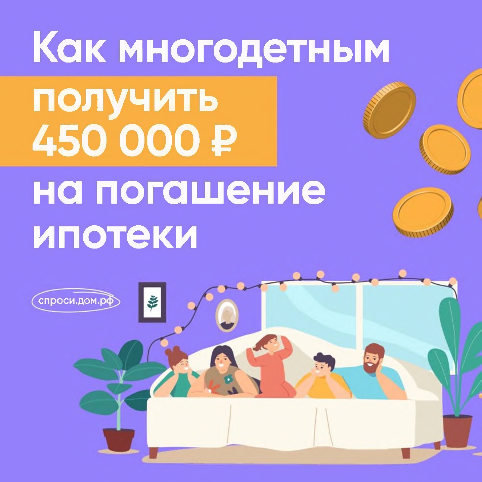 Получите помощь от государства при покупке жилья и улучшении жилищных условий. Выплату на получение 450 000 рублей на погашение задолженности по ипотечному кредиту могут получить семьи, в которых с 1 января 2019 года по 31 декабря 2023 года появился третий или последующий ребенок.