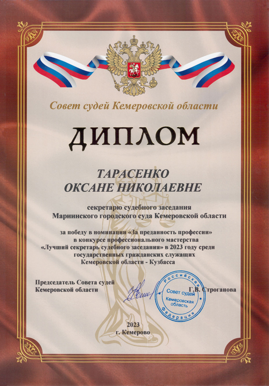 2 июня 2023 года в Кемеровском областном суде состоялся заключительный этап конкурса профессионального мастерства «Лучший секретарь судебного заседания» среди государственных гражданских служащих Кемеровской области, замещающих должности секретаря судебного заседания. По итогам конкурса секретарь судебного заседания Мариинского городского суда Кемеровской области Тарасенко Оксана Николаевна признана победителем в номинации «За преданность профессии». Организатором конкурса профессионального мастерства «Лучший секретарь судебного заседания» в 2023 году среди государственных гражданских служащих Кемеровской области – Кузбасса выступил Совет судей Кемеровской области совместно с Кемеровским региональным отделением Общероссийской общественной организации «Российское объединение судей».