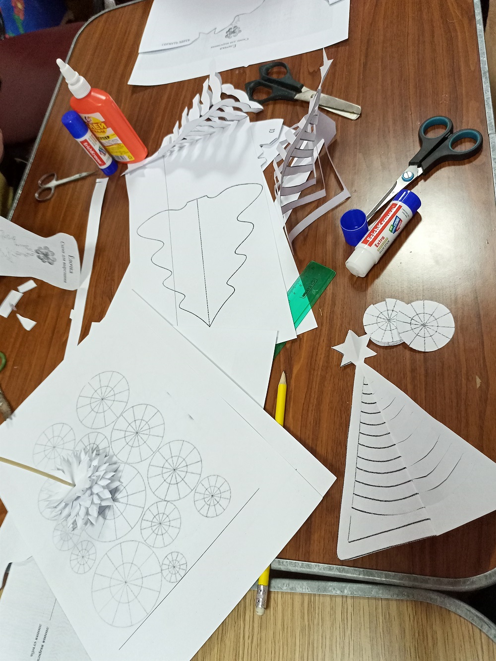 Для нашей объемной поделки, понадобится шаблон, который необходимо перенести на бумагу (подойдет обычная офисная). Далее cложите листы бумаги пополам и вырезайте из них елочки. Затем от центра к периферии сделайте надрезы. Расправьте в разные стороны получившиеся ярусы «елочных веток» и вас получатся 3D елочки из бумаги.