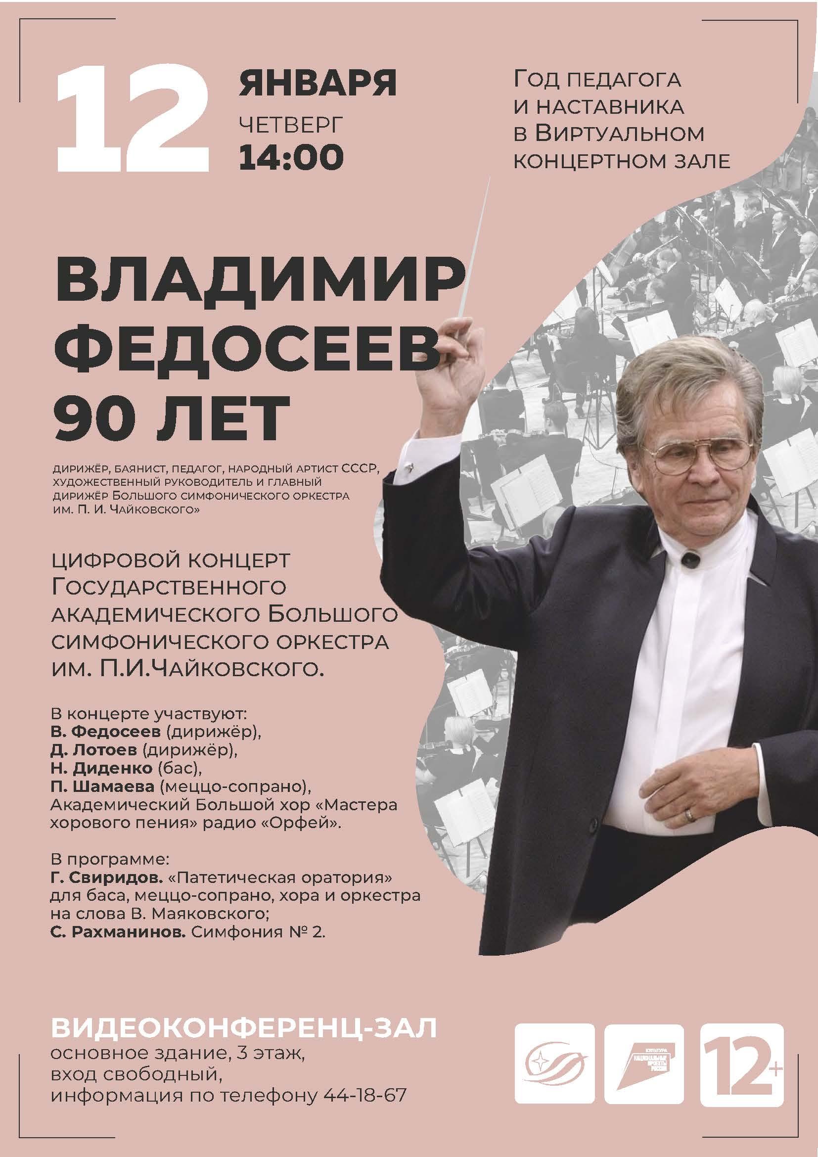12 января в 14:00 в Виртуальном концертном зале Государственной научной библиотеки Кузбасса им. В.Д. Федорова, созданном в 2020 году в рамках национального проекта «Культура», состоится концерт Государственного академического Большого симфонического оркестра им. П.И. Чайковского, посвященный Году педагога и наставника.