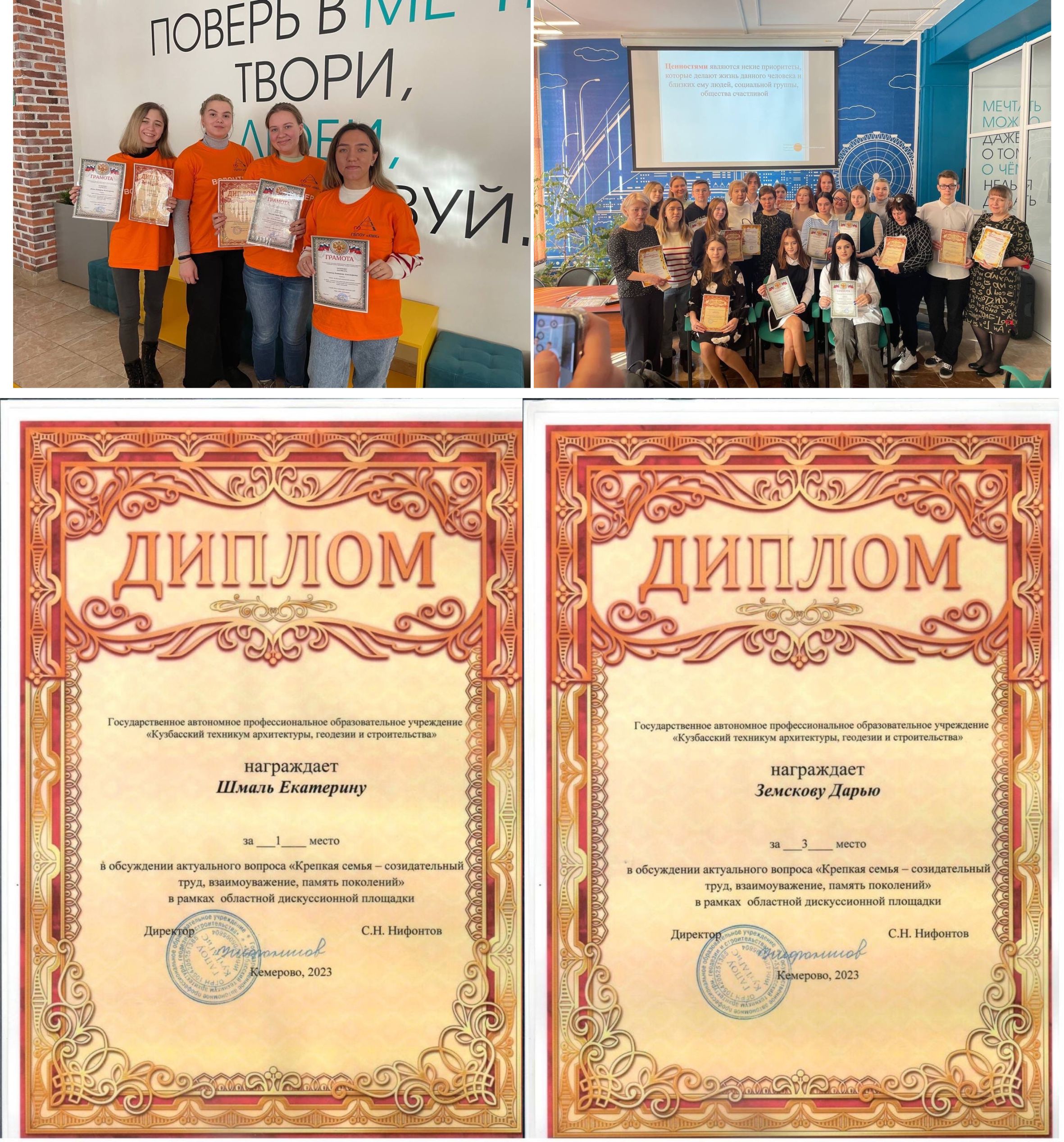 Перед торжественным закрытием обсуждений «Крепкая семья – созидательный труд, взаимоуважением, память поколений» состоялось долгожданное награждение. Шмаль Екатерина отмечена дипломом за I место и Земскова Дарья – дипломом за III место.