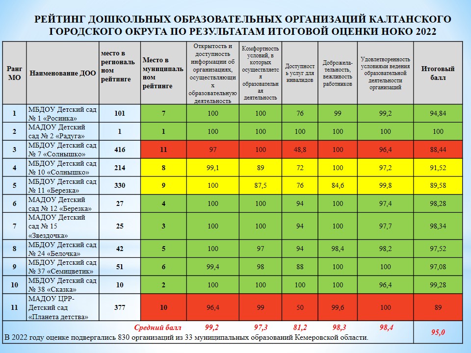 В 2022 году оценке подвергались 830 организаций из 33 муниципальных образований Кемеровской области-Кузбасса. По результатам независимой оценки качества условий осуществления образовательной деятельности Калтанский городской округ занимает I место среди муниципалитетов Кузбасса, 1 место среди дошкольных образовательных организаций Кемеровской области-Кузбасса занял МАДОУ Детский сад № 2 «Радуга».