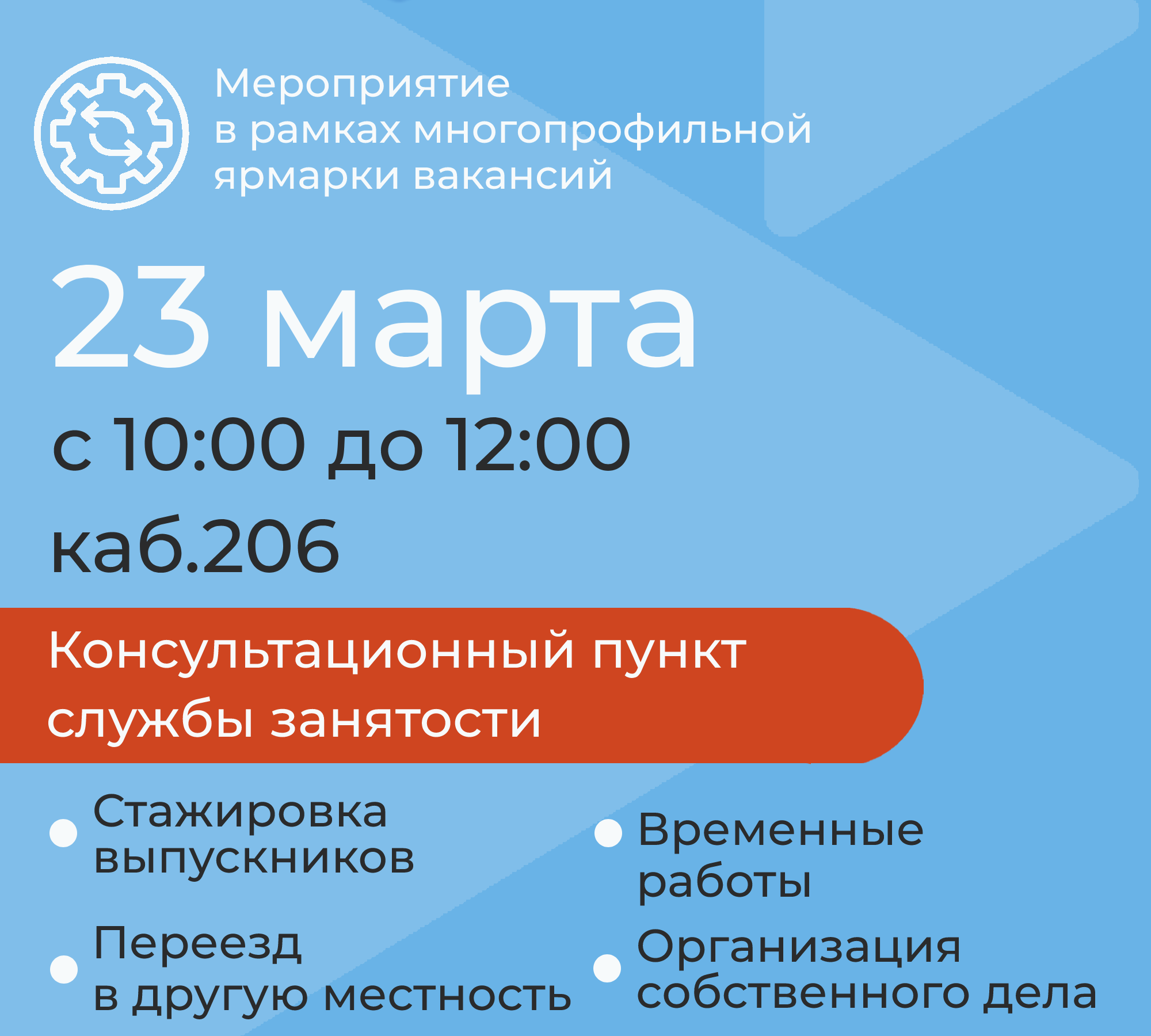 23 марта на многопрофильной ярмарке вакансий будет работать консультационный пункт службы занятости.