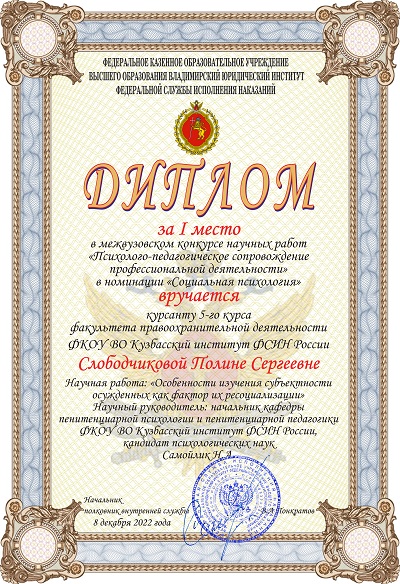 В конце 2022 года во Владимирском юридическом институте ФСИН России были подведены итоги межвузовского конкурса научных работ по психологии и педагогике «Психолого-педагогическое сопровождение профессиональной деятельности». В конкурсе приняли участие научные работы обучающихся Кузбасского института ФСИН России, Владимирского государственного университета имени А.Г. и Н.Г. Столетовых, Кировского института повышения квалификации работников ФСИН России, Вологодского института права и экономики ФСИН России.