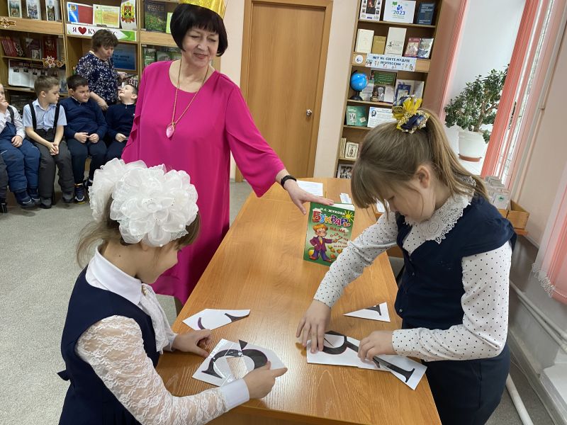 Поздравить юных школьников пришла Королева книг, с которой они играли и участвовали в различных конкурсах: «Перевертыши», «Найди слово в слове», «Живые слава», «Составь предложение» и другие. Дети приняли участие в эстафете «Собери букву», в игровой форме ответили на вопросы викторины по сказкам, разгадали ребусы, анаграммы и загадки.