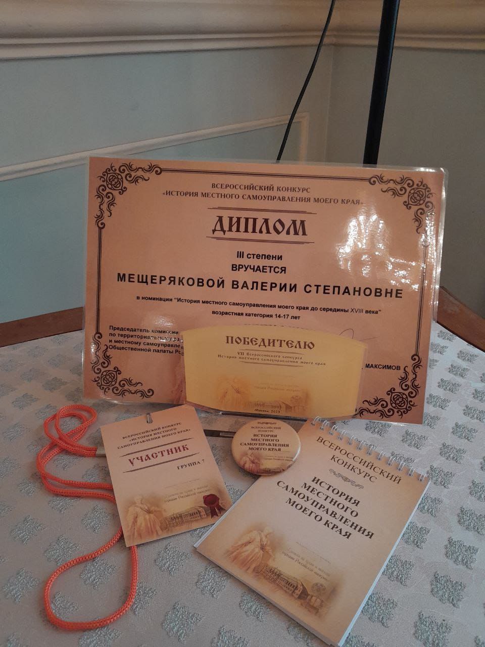 3-е место на федеральном уровне. Номинация: Исследование: История местного самоуправления моего края до середины 18 века (на примере города Кузнецка и Сибирского края).