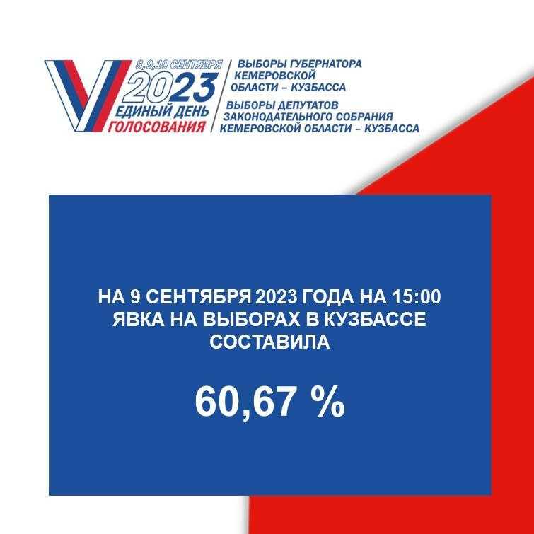 По данным Избирательной комиссии Кузбасса, на 15:00 9 сентября явка на выборах составила 60,67%, это более 1,158 млн кузбассовцев, внесенных в списки избирателей.