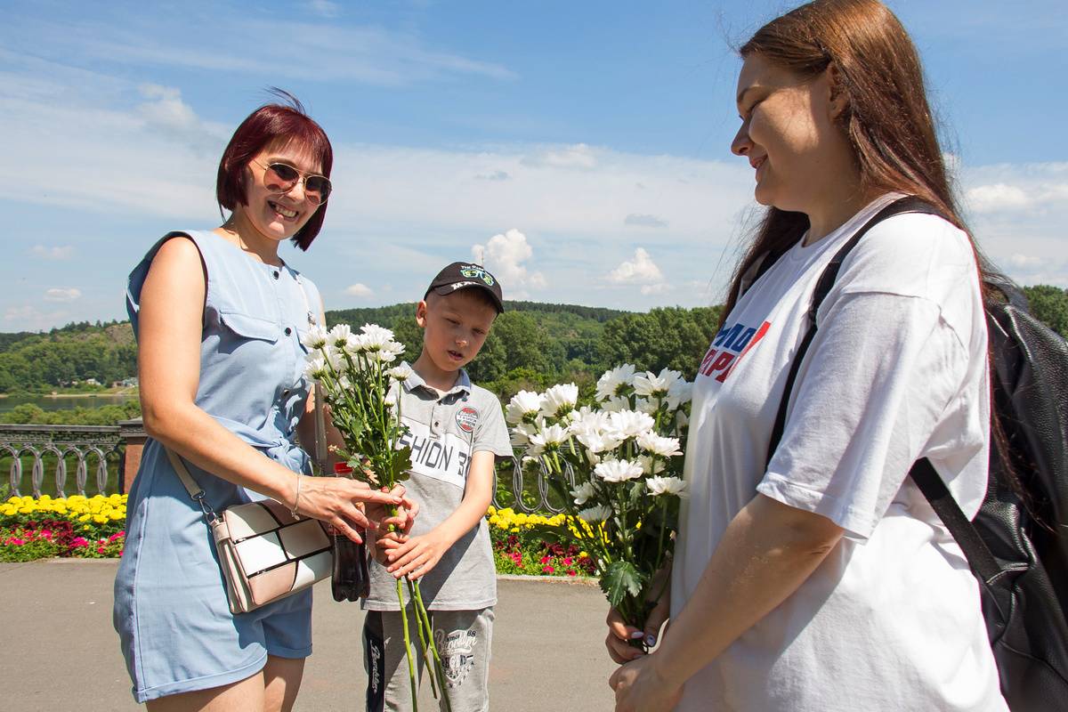 На Притомской набережной волонтеры «Молодой Гвардии» в честь всероссийского праздника подарили 30 букетов хризантем прохожим парам,