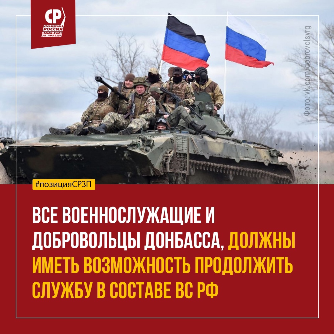 ☝ "Все военнослужащие и добровольцы Донбасса, должны иметь возможность продолжить службу в составе ВС РФ. При этом военнослужащие Донбасса самые мотивированные и грамотные бойцы из участников СВО. Они восемь лет противостояли атакам неонацистов. Сегодня их опыт как никогда востребован. Социалисты направят обращение в Министерство обороны РФ с призывом внимательнее подходить к интеграции подразделений Народной милиции", – заявил председатель Социалистической партии "СПРАВЕДЛИВАЯ РОССИЯ – ПАТРИОТЫ – ЗА ПРАВДУ", руководитель фракции " СПРАВЕДЛИВАЯ РОССИЯ – ЗА ПРАВДУ " В Государственной Думе РФ Сергей Миронов.