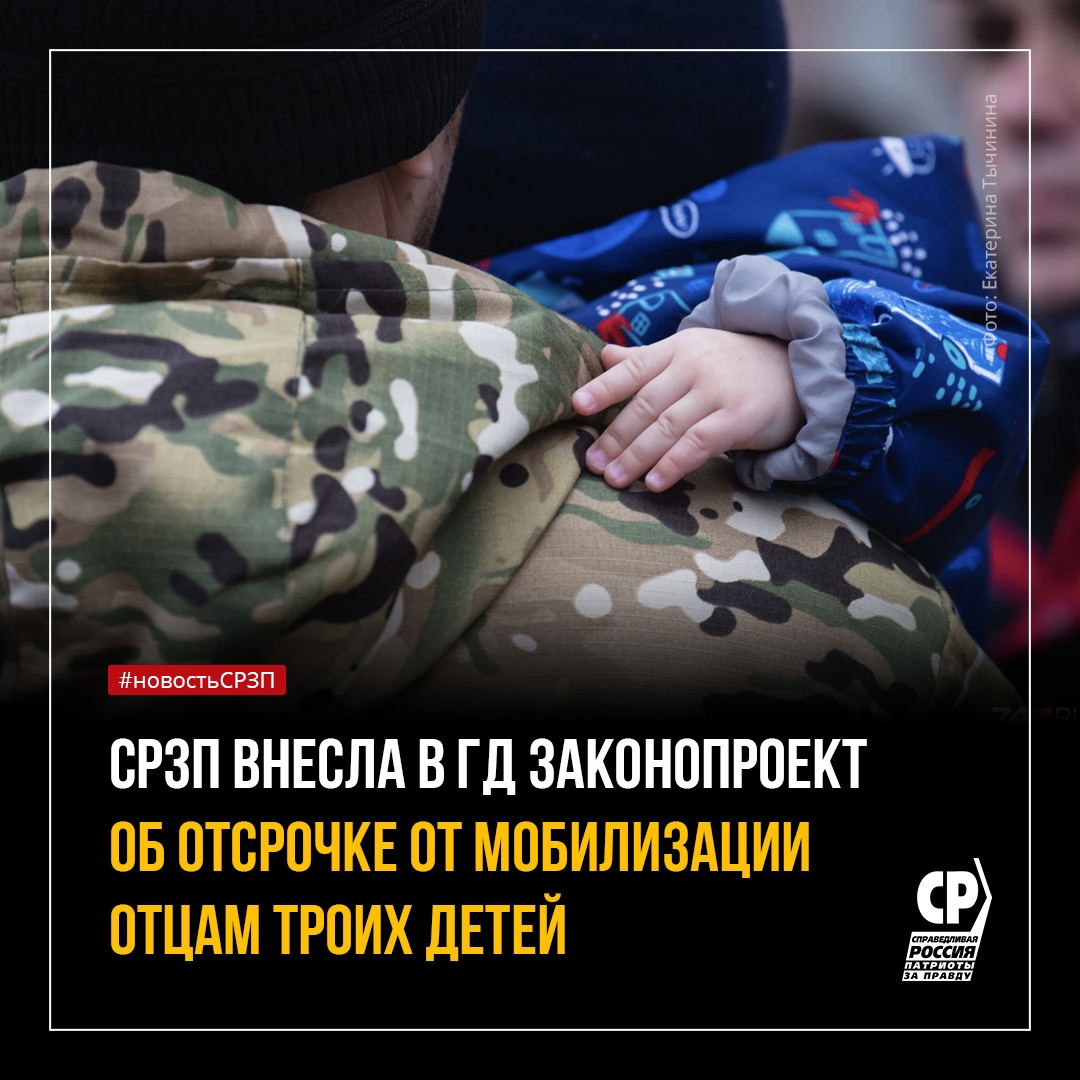 📑 Социалистическая партия "СПРАВЕДЛИВАЯ РОССИЯ – ПАТРИОТЫ – ЗА ПРАВДУ" в Госдуме настаивает на принятии законопроекта, который окончательно закрепит предоставление отсрочки от призыва в армию по мобилизации для многодетных отцов. Её должны получать: