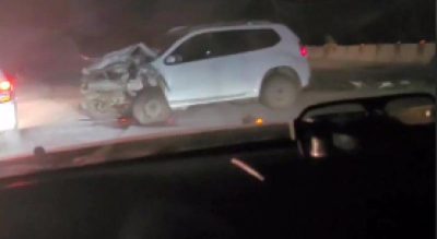 Судя по кадрам, от удара у одной из легковушек сильно повредило передний бампер.