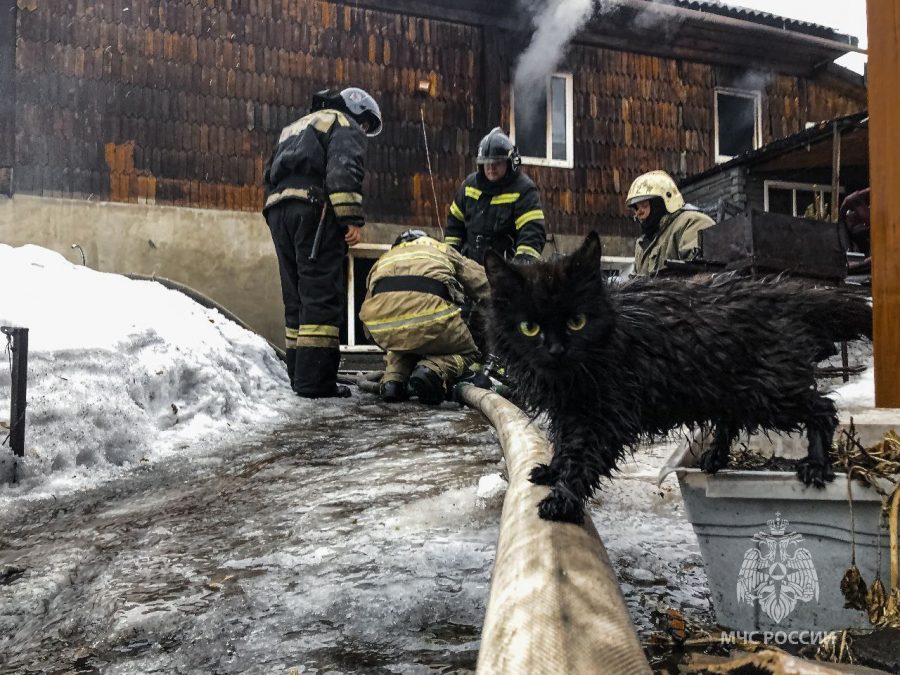 По информации МЧС РФ, возгорание произошло на улице Пролетарская в южной столице Кузбасса. Вместе с пожарными в устранении ЧП принимал участие … кот. Мокрое и взъерошенное животное стояло, опираясь передними лапами на шланг.