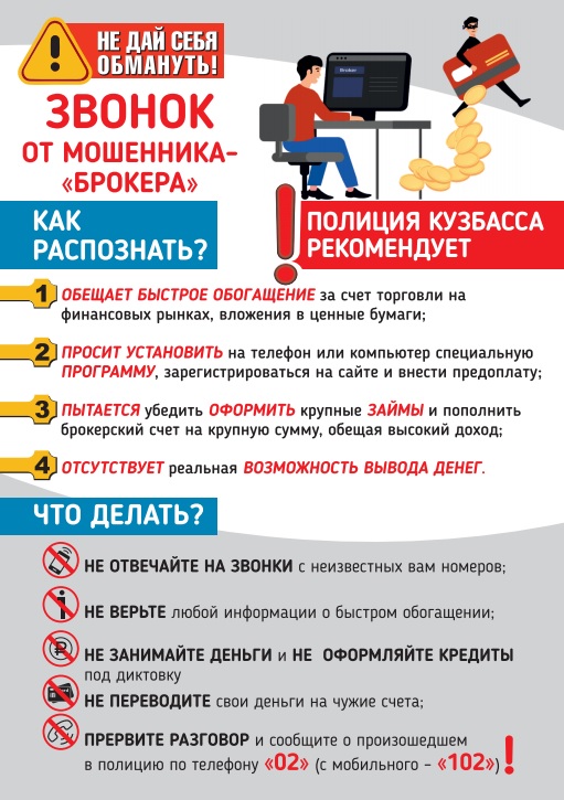 Полицейские напоминают гражданам о необходимости проявлять бдительность. Если вы хотите принять участие в инвестиционном проекте, узнайте его детали на официальном сайте или по телефону горячей линии организации, которая его представляет, и только потом принимайте решение о вложении средств. Все обещания о выплате якобы причитающихся компенсаций следует перепроверять. Обязательно посоветуйтесь с родственниками, прежде чем выполнять какие-либо действия со своими счетами. Не передавайте незнакомцам конфиденциальные сведения, реквизиты банковской карты, включая защитный CVV-код, не выполняйте никаких действий под диктовку неизвестных. Будьте бдительны и не дайте себя обмануть! Больше информации по профилактике дистанционных краж и мошенничеств можно найти на сайте 42.мвд.рф в разделе «Предупрежден – значит вооружен!».