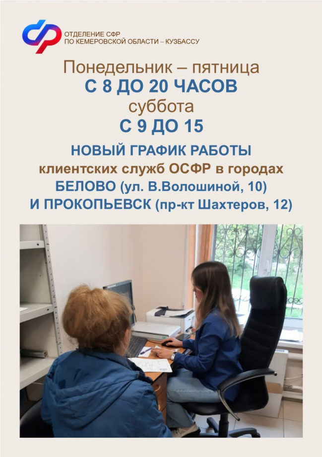 1117 человек обратились в дополнительные часы работы в клиентские службы СФР в Белове (ул. В. Волошиной, 10) и Прокопьевске (пр-кт Шахтеров, 12).