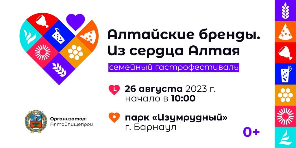 26 августа в столичном парке культуры и отдыха «Изумрудный» (г. Барнаул, пр-т Комсомольский, 128) состоится одно из самых грандиозных событий этого лета – семейный гастрономический фестиваль «Алтайские бренды. Из сердца Алтая». Свою лучшую продукцию представят более полусотни производителей региона: на ярмарочных рядах в парковой зоне можно будет встретить широкое разнообразие продуктовых брендов Алтайского края – сыры и молочную продукцию, мясо и рыбу, крупы и макароны, муку и хлеб, мед, пантовую и фитопродукцию, снеки и закуски, растительные масла и, конечно, безалкогольные напитки.