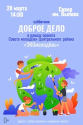 28 марта 2024 года в 14:00 часов в сквере им. Выпова пройдёт субботник «Доброе дело» в рамках проекта Совета молодёжи Центрального района «ЭКОмолодёжь» .