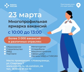 23 марта в Кадровом центре "Работа России" города Новокузнецка пройдет многопрофильная ярмарка вакансий!
