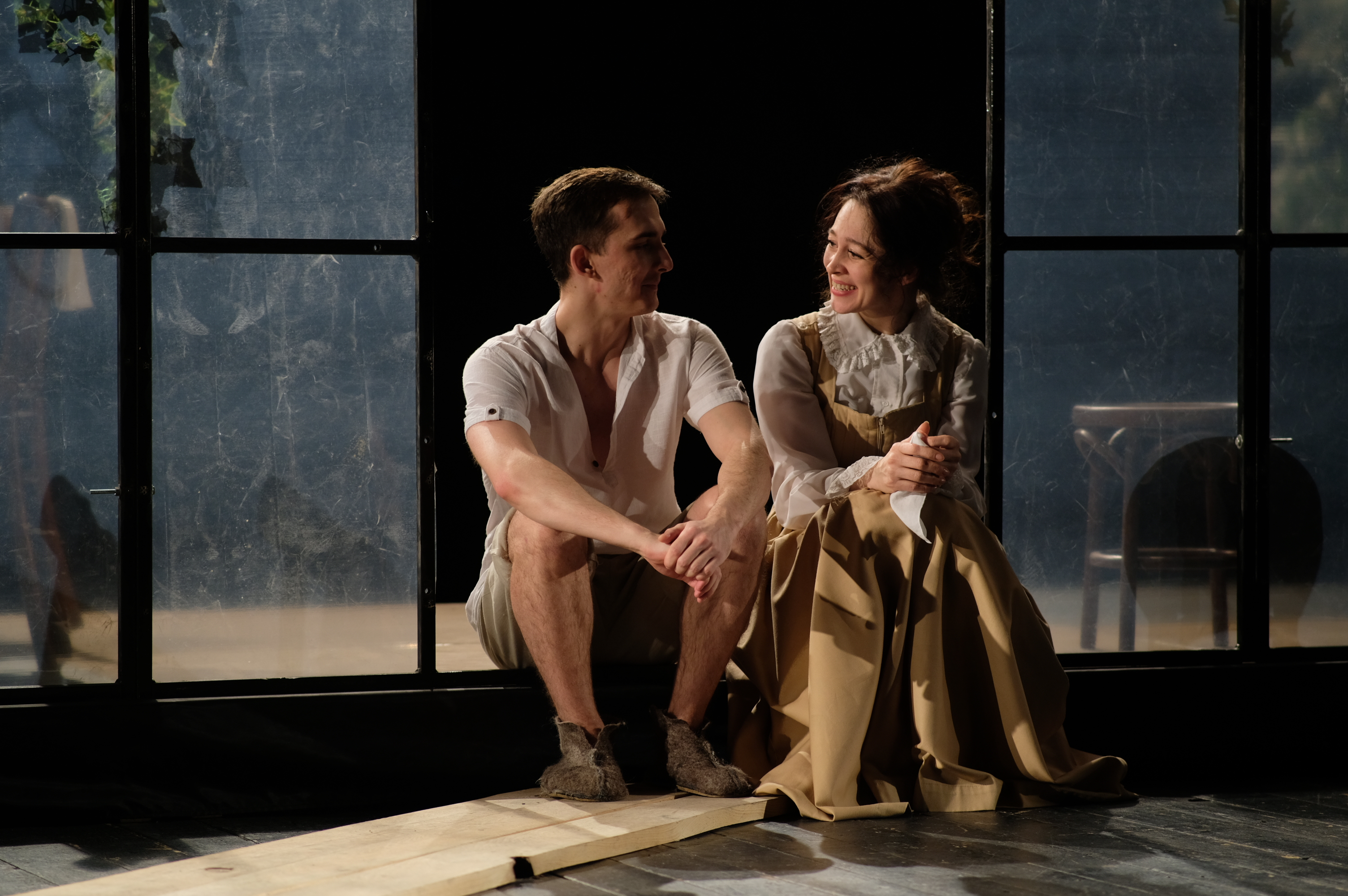 «Душно, душно, духота», — нашептывает голос с первых минут эскиза. И мы тут же замечаем на сцене противопоставление двух «миров»: условностей, ограниченности пространства, замкнутости и внутренней свободы. Изнуренные и разморенные летним зноем герои находятся… в парнике, где еще труднее дышать! Между тем как Беляев (актер Михаил Дмитриев) делает то, что ему хочется, окунается в бочку с водой. Вместе с Верой они резвятся, обрызгивают друг друга из пульверизаторов. Молодой человек придумывает забаву – держась за концы каната, кружиться и раскачиваться, как на качелях, и это весело!