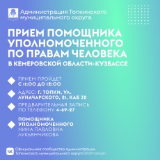 18 июня пройдет прием помощника уполномоченного по правам человека в Кемеровской области-Кузбассе Лукьянчиковой Нины Павловны Место встречи: г. Топки, ул.