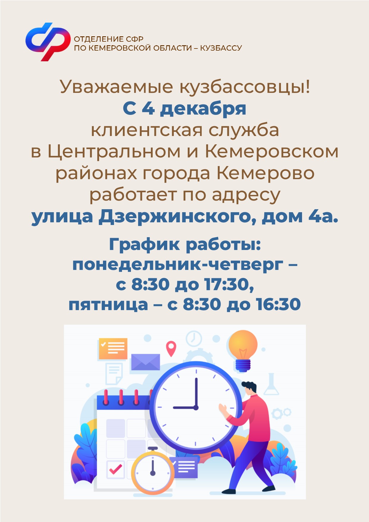 Уважаемые кузбассовцы, кемеровчане и жители Кемеровского района! С 4 декабря 2023 года клиентская служба ОСФР в Центральном и Кемеровском районах города Кемерово работает в здании Отделения СФР по адресу улица Дзержинского,