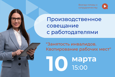 10 марта 2022 в Кадровом центре "Работа России" города Новокузнецка состоится производственное совещание с работодателями "Занятость инвалидов. Квотирование рабочих мест".