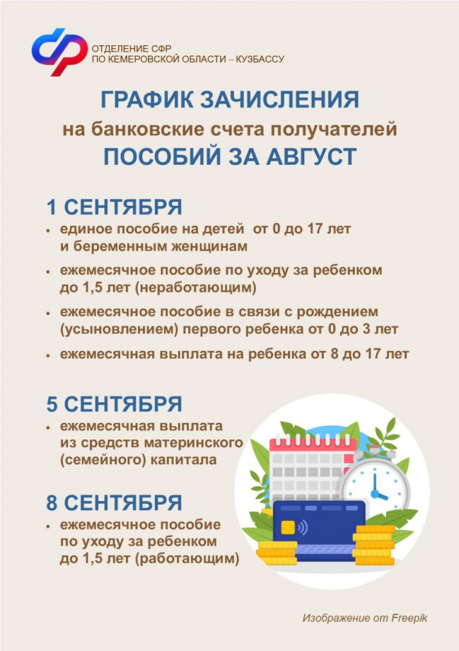 Если дата приходится на выходной день, то выплата поступает в ближайший рабочий день накануне. Например, в сентябре, в нашем случае, – не 3 сентября, а 1-го, в пятницу.