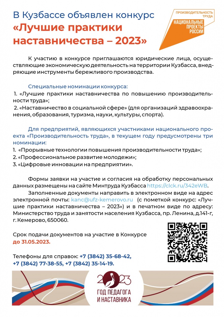 Цель конкурса - выявление и распространение передового практического опыта наставничества для повышения производительности труда, поощрение и признание наставников, внесших значительный вклад в развитие наставничества и тиражирование эффективных практик наставничества в Кузбассе. Конкурс организован Минтрудом Кузбасса в рамках реализации национального проекта «Производительность труда» в Кузбассе и Года педагога и наставника – 2023. Перечень номинаций, условия участия и сроки проведения конкурса представлены в содержании информационной листовки (прилагается). https://clck.ru/342eWB