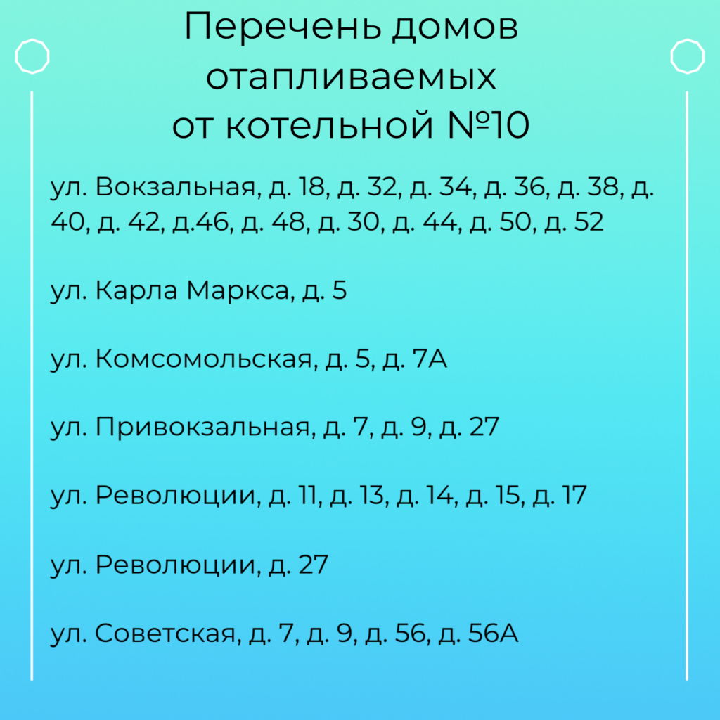 В связи с передачей в оперативное управление МКП «ТЕПЛО» котельной № 10, уведомляем Вас о необходимости с 01.08.2023 перезаключить договора на коммунальные услуги (горячее водоснабжение и отопление) с ресурсоснабжающей организацией.