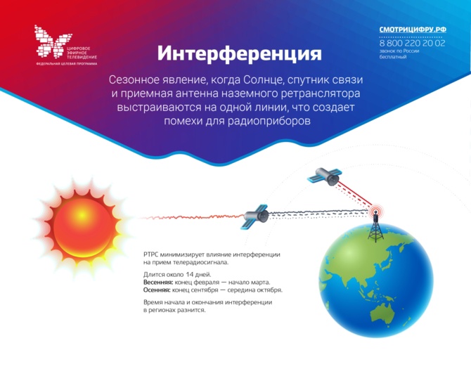 Солнечная интерференция происходит дважды в год: весной и осенью. В эру аналогового телевещания Солнце вызывало массовые сбои в трансляции программ. Цифровые технологии позволили свести к минимуму воздействие интерференции. Это стало возможно благодаря внедрению систем оперативного резервирования.