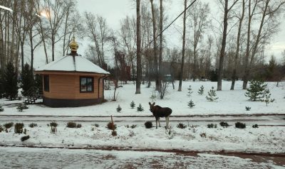 В Кемерове молодая лосиха забрела на территорию храма Архангела Михаила в Рудничном районе города.