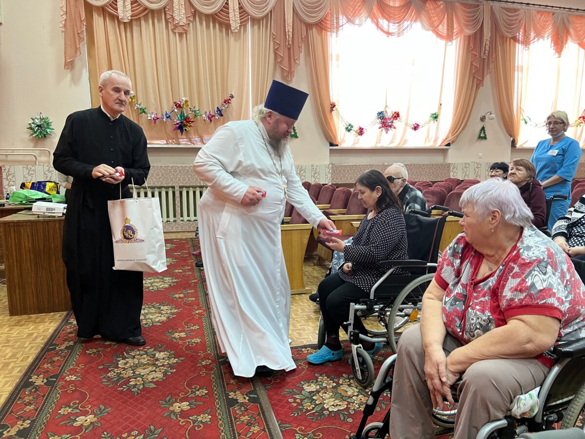 Настоятель храма протоиерей Николай Борецкий поздравил жителей дома-интерната с Рождеством Христовым и вручил им рождественские подарки.