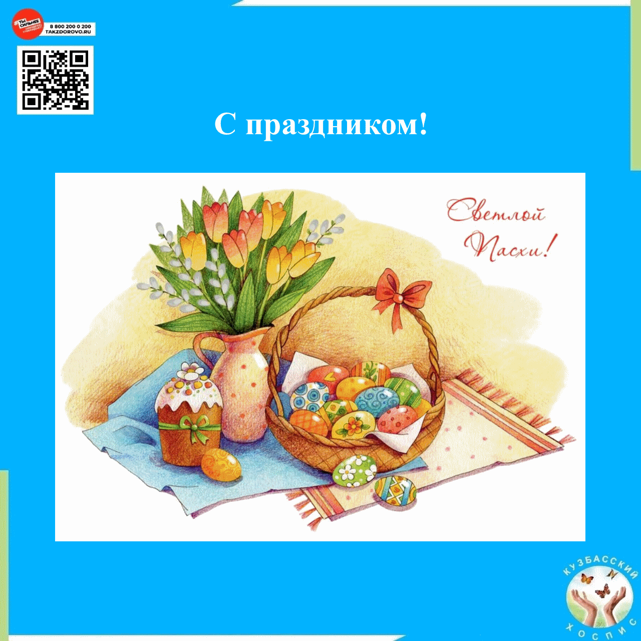Дорогие друзья, коллектив Кузбасского хосписа поздравляет вас с наступившим светлым праздником Пасхи! Желаем мира, добра и счастья вашему дому, здоровья, хорошего настроения, любви и поддержки вам и вашим близким!