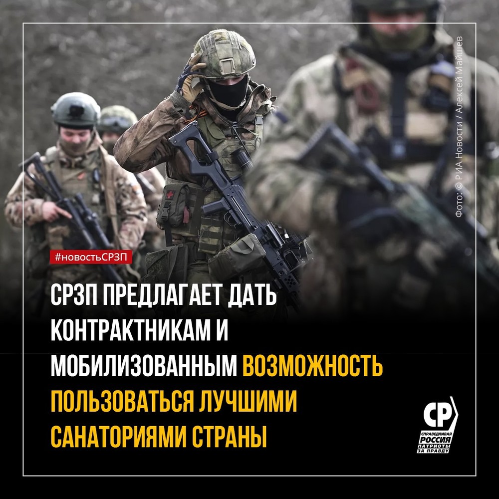 Предоставить возможность контрактникам, мобилизованным, бойцам добровольческих формирований и членам их семей отдыхать и проходить санаторно-курортное лечение в санаториях, пансионатах, на турбазах, в домах отдыха и детских оздоровительных лагерях федеральных органов власти. Это лучшие в стране санатории, и они должны стать доступны для всех участников СВО и членов их семей, наравне с военнослужащими.