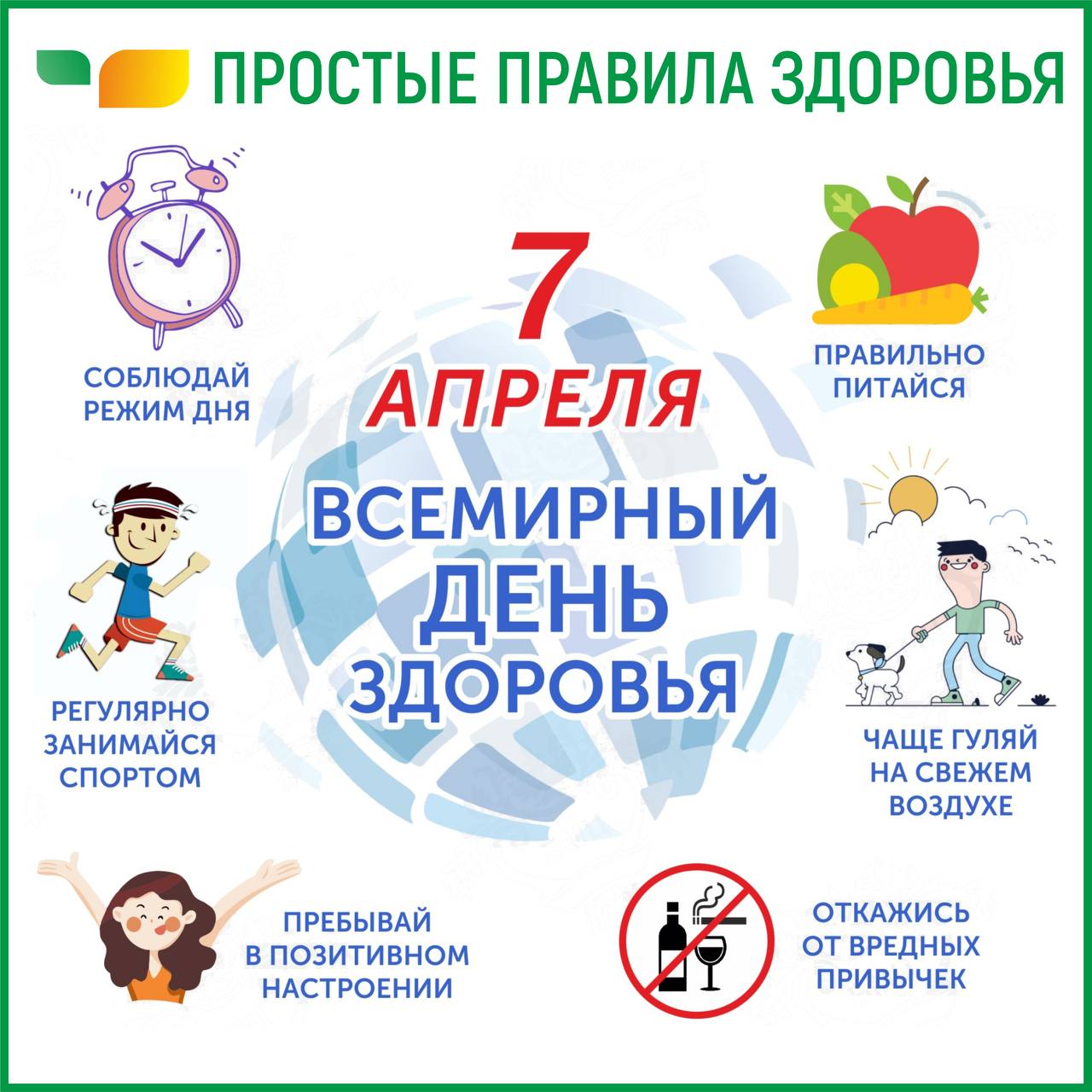 Всемирный день здоровья призван ориентировать людей на употребление здоровой пищи, отказ от курения и избыточного потребления алкоголя, занятия физическими упражнениями, участие в активных видах отдыха т.д. Любой россиянин может бесплатно пройти обследование и получить индивидуальные рекомендации по ведению здорового образа жизни и отказу от вредных привычек в государственных центрах здоровья для взрослых и детей, действующих по всей России.