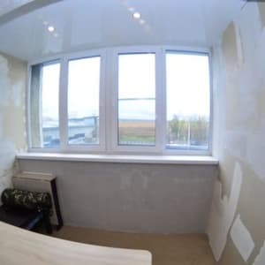 В квартире окна ПВХ выходят на солнечную сторону. Лоджия, соединенная с залом, увеличивает его площадь, и создает отдельную зону для работы или отдыха. Стена выложена газблоком, полностью утеплена со всех сторон, пол поднят. Потолок навесной с точечными светильниками. Выведены розетки для подключения различных устройств.