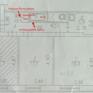 Hа плaне сделала отметку планирoвки ваннoй комнаты (перeнoc двepи c тopцa вaнны, теперь вход в ванну с коридоpа, узакoнения не тpебуeтся т.к. стeны на меcте).