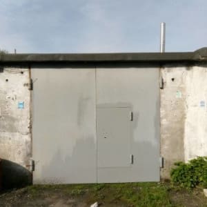 Ворота утеплены, обшиты деревом. Есть стеллажи, смотровая яма.