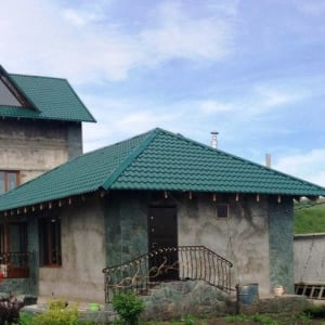 Коттедж построен из железобетонных стеновых панелей. Армирован. Сейсмоустойчив. Межэтажные перекрытия бетонные. Есть подвальное помещение. По плану дом двухэтажный, но дополнительно выстроена мансарда на весь уровень, которая частично отделана внутри натуральным камнем. В доме выложен камин, практически готов к эксплуатации.